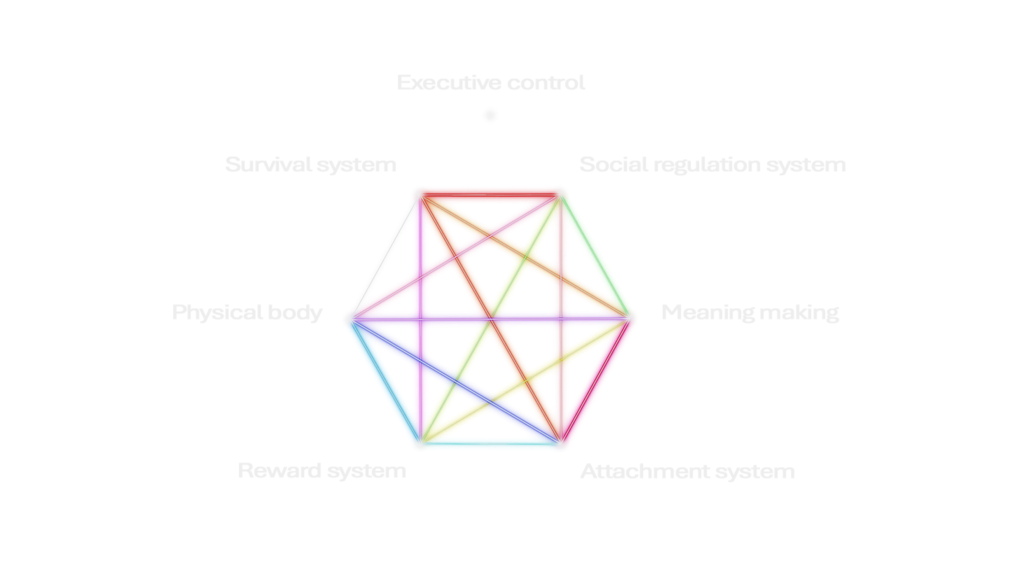 VTMM is a coverage map for a broad range of negative, trauma-related feelings—organizing them into a small set of underlying affect systems and the connection spectrums that shape how those systems interact.It works by translating an internal state into an activation pattern: which systems are active, how strongly they’re activated, and the strength and direction of their interaction across key connections.Once the pattern is legible, the experience can become more coherent / more interpretable which often reveals specific levers that generate and sustain it.7 Systems